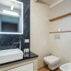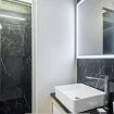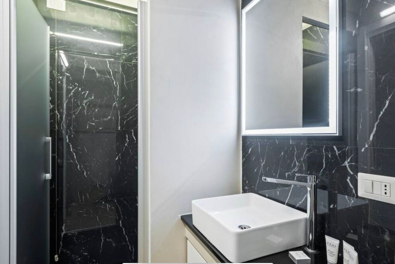 - Bagno. Un ambiente moderno e molto elegante, rifinito in gres effetto marmo nero e dotato di doccia, WC, bidet e lavabo con specchio retroilluminato.