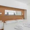 - Disimpegno / zona armadi + 5° posto letto. Alla destra della porta d'ingresso, si trova un largo disimpegno che ospita un'ampia zona di armadiature su misura e una poltrona letto singola.