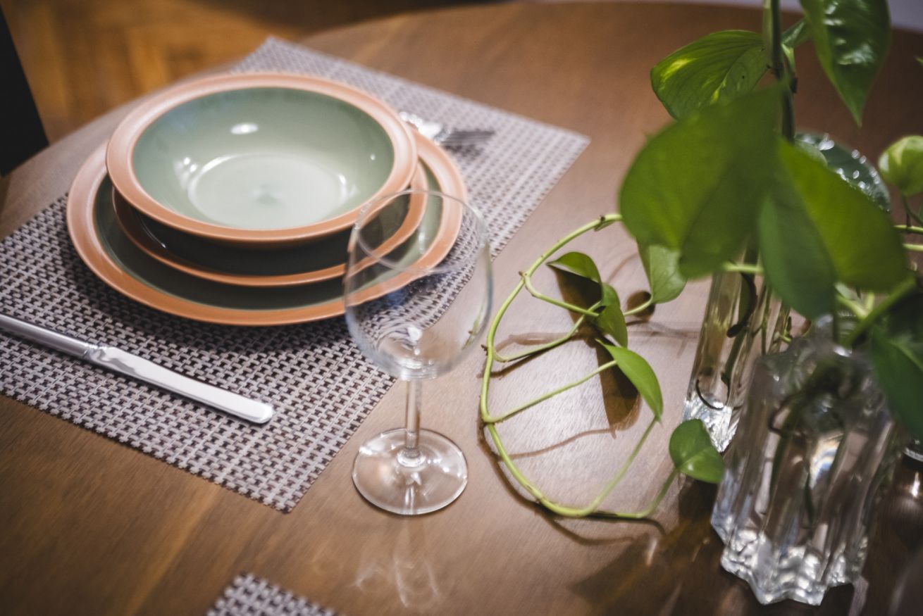 macchina del caffè, bollitore, stoviglie complete, piatti, bicchieri e calici