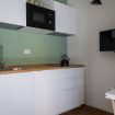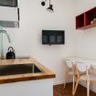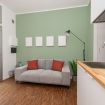 - Una zona giorno luminosa con divano letto matrimoniale, una piccola cucina attrezzata (con frigo, piastra a induzione e micrronde), un tavolo per due e balconcino che affaccia su un tranquillo cortile interno.